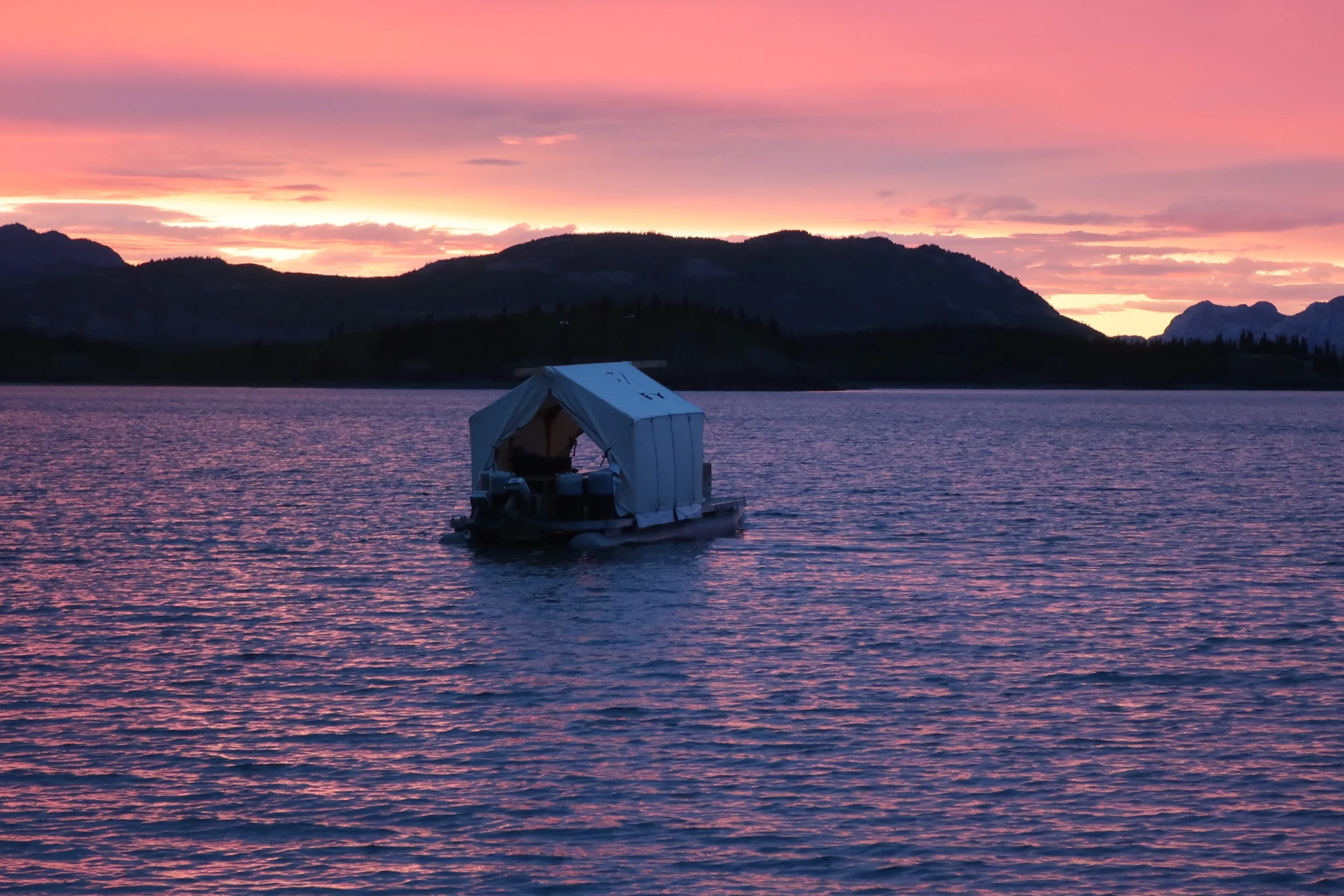 Three AM was pretty dark, the small patch of glow in the northern sky could have been either the last of the sunset or the start of the sunrise, still it was pretty dark. It had just started raining and the wind switched decidedly from northeast to south along with what may have been storm clouds and it was getting colder. I put on my shorts and sandals and grabbed the last of the loads to take to the boat and waded out through the mud and rocks in knee deep water to where we were anchored in slightly deeper water. Jeff stripped to his underwear for the slog and we both changed clothes in the darkness of the tent under our headlights while the motor idled in warmup. Kooney and Lois untied the stern line that held us back and as 2:59 turned to 3:00 we pulled the anchor and headed into the darkness towards the middle of Lake Lebarge.